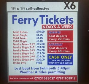 The last boat returning from Falmouth will be at 5.40pm (weather and tides permitting). The bottom gate towards Falmouth marina will remain open until 9pm for cars to exit.